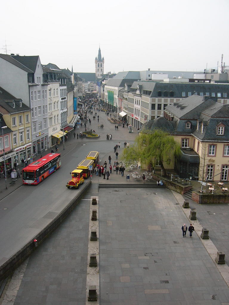 Blick von der Porta Nigra, die wohl früher Porta Martis hieß, in die Innenstadt. Hinten, wo so viele Leute zu sein scheinen, ist der
